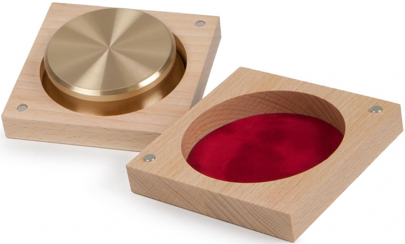 Прижим для пластинок. Улучшает сцепление пластинки с опорным диском и дополнительно гасит резонансы. Изготовлен из бронзы.