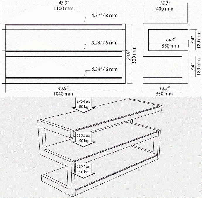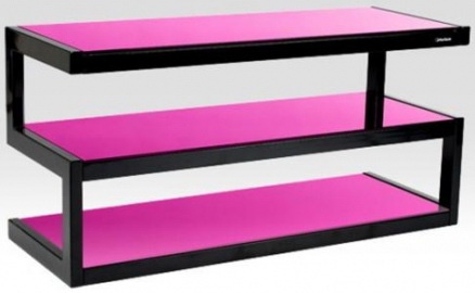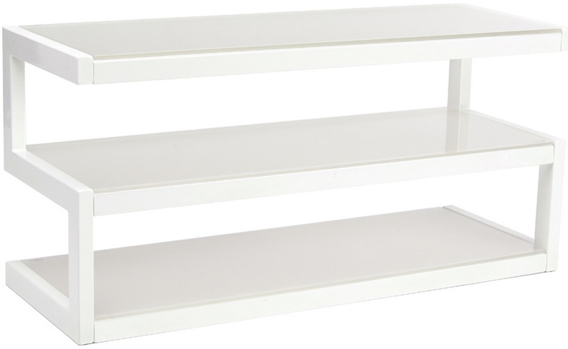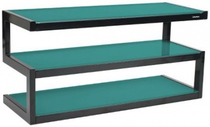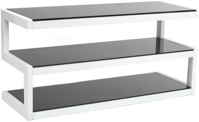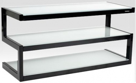 Стойка под Hi-Fi компоненты, 3 полки, расстояние между полками 189 мм, максимальная нагрузка на верхнюю полку 80 кг, на две нижние полки 50 кг, несущая конструкция — черный или белый металл, материал полок — стекло.