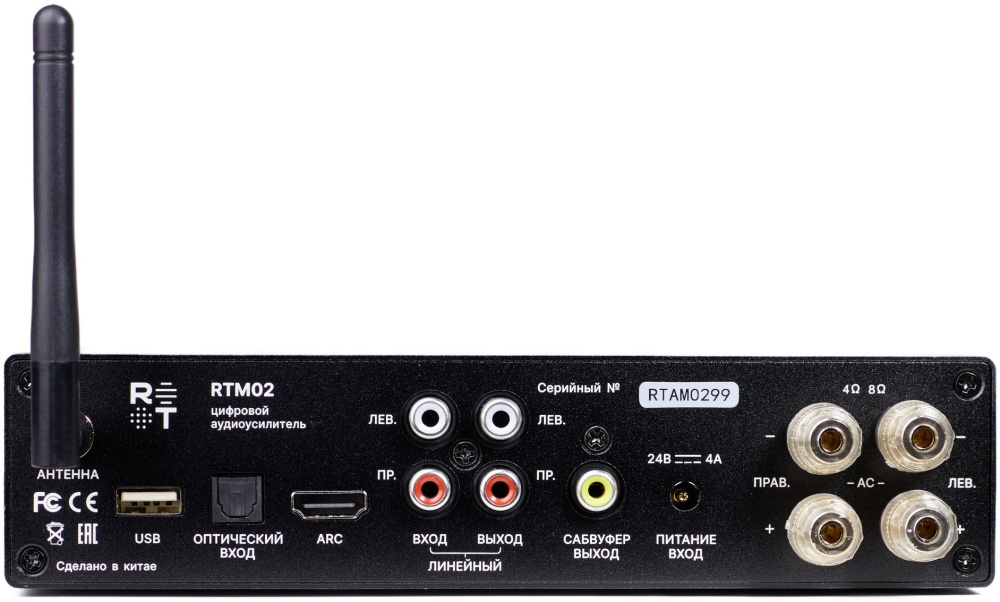 - Входы — линейный RCA; оптический Toslink; HDMI ARC; USB; микрофонные аудиовходы (6.3 jack)