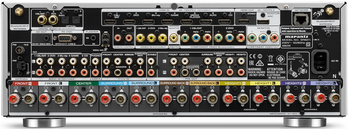 Процессор 11.2 каналов. HDMI 2.0a, HDCP 2.2 на всех 8 входах HDMI. 4K с HD 60 Гц, 4:4:4, High Dynamic Range (HDR), 21:9 видео, 3D